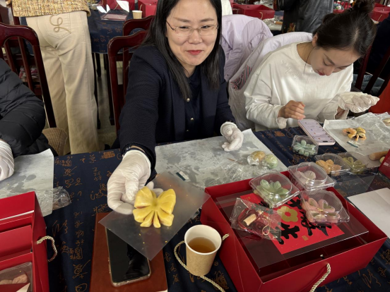 手作环节里,大家在石老师的耐心指导下揉面、分剂、包酥、开酥、塑形,动作认真细致,现场氛围轻松温馨。大家纷纷表示,亲手制作花酥既有趣又治愈,在指尖技艺中放慢节奏、舒缓压力,既体验了非遗乐趣,也收获了满满的成就感。活动最后,老师们将制作完成的花酥精心装入礼盒,把带着春日暖意与非遗馨香的美好亲手珍藏。