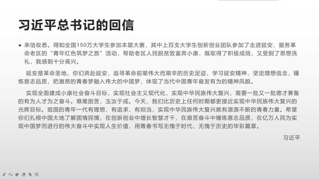 本次活动分为“了解‘互联网+’大赛相关知识”、“回顾习近平总书记的回信”和“学习创新意识相关知识”三部分。活动开始时,团支书结合“‘互联网+’山东省大赛推进讲座”、“第六届山东省‘互联网+’大学生创新创业大赛高教主赛道参赛指南”、“第六届山东省‘互联网+’大学生创新创业大赛青年红色筑梦之旅赛道参赛指南”等相关文件,向同学们讲述了“互联网+”大赛的有关事项,并带领同学们回顾了习近平总书记回信的相关内容,更好的将“互联网+”大赛与青年红色筑梦之旅相联系。此外,团支书结合视频从“什么是创新意识”、“创新意识的作用”、“如何培养自己的创新意识”三方面,向同学讲述了创新意识对于新一代青年的意义与作用,坚定了同学们自主创新的信念,锤炼了同学们的创新品质。
