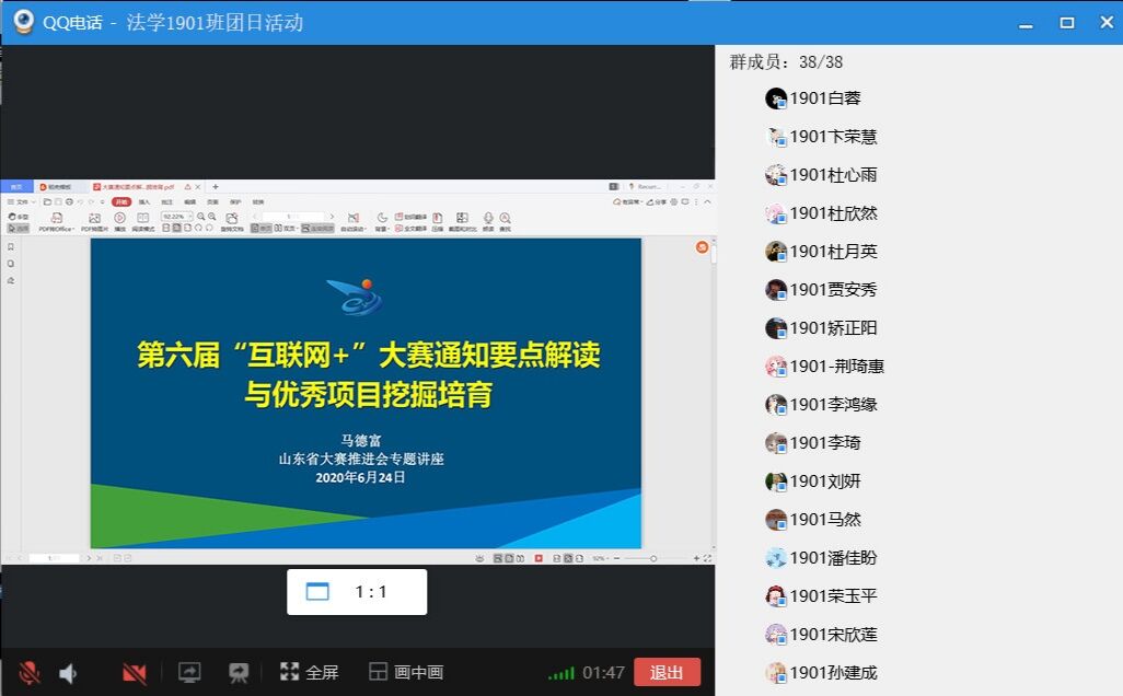 6月30日,法学院组织全体学生通过线上QQ语音、屏幕分享等形式开展了“学习第六届山东省‘互联网+’大学生创新创业大赛”主题团日活动。