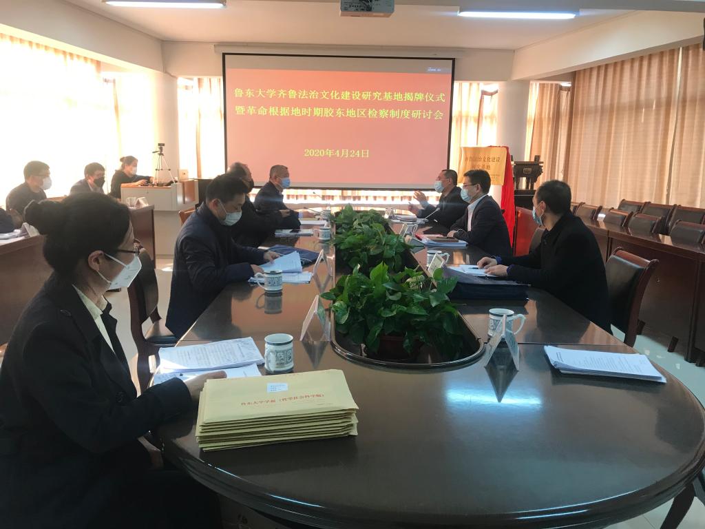4月24日下午,我校在法学院举行齐鲁法治文化建设研究基地揭牌仪式暨革命根据地时期胶东地区检察制度研讨会。党委常委、副校长亢世勇与烟台市牟平区人民检察院党组书记、检察长孙延杰共同为基地揭牌。亢世勇代表学校为孙延杰颁发了基地研究员聘书。来自牟平区人民检察院、我校法学院、《鲁东大学学报(哲社版)》的专家学者出席揭牌仪式并进行了交流研讨。