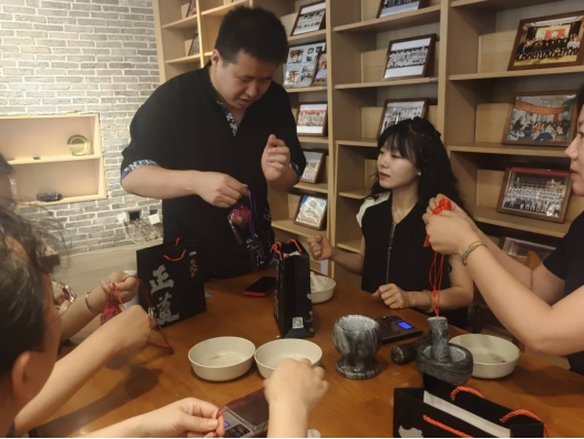 本次活动邀请胶东传统手作香制作技艺市级代表性传承人王德正老师主讲。活动中,王老师从香囊的起源、寓意讲起,介绍了香的祈福祭祀等传统用途,并通过视频向大家展示了制粉、调和等手作制香的工序及过程,引起了大家的浓厚兴趣。