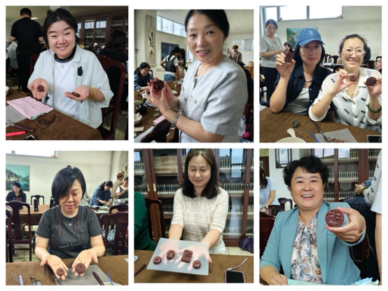 活动现场,王老师指导教师们调和香粉,揉成香泥,选取寓意美好的传统纹样模具,刷上甜杏仁脱模油,填入香泥,压实脱模,修型穿孔,待香泥自然风干后,穿绳系结,一个个纹饰精美、散发淡淡馨香的古朴香牌便制作完成。教师们纷纷品鉴这凝聚了千年香道文化的传统雅物,现场洋溢着收获的喜悦。